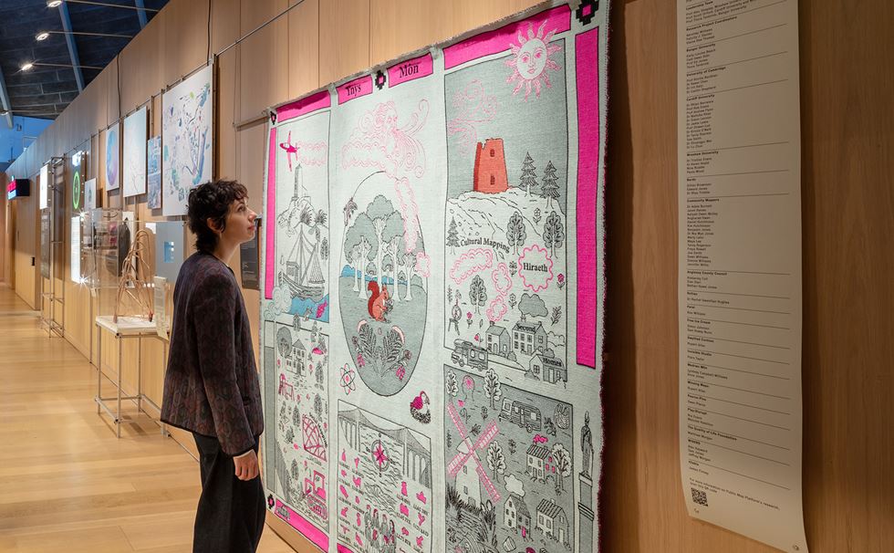 ‘A Tapestry for Anglesey’ captures the layered experiences and shifting realities of life on Ynys Môn. This tapestry by artist Sarah Hersi was hand-woven on a jacquard loom by Dash and Miller. Its creation is a nod to the tradition of Welsh tapestry making, reimagined here to reflect contemporary stories, social landscapes and the unmappable aspects of life.