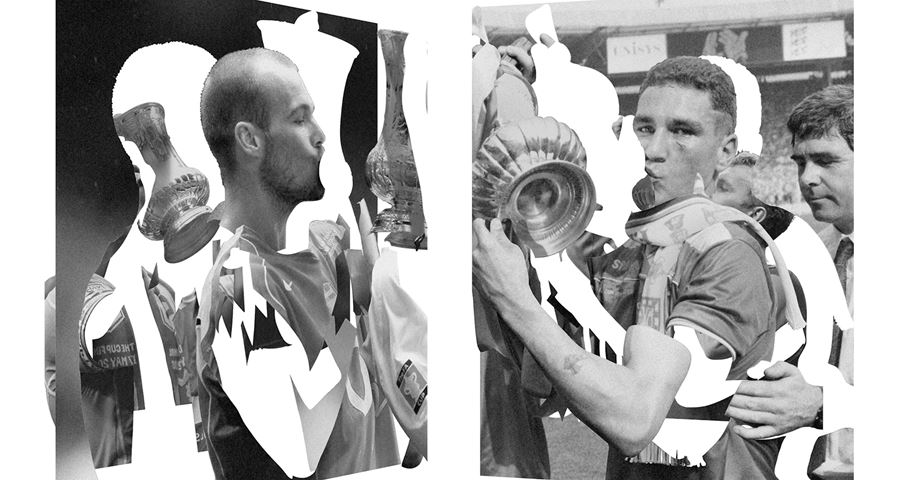 These videos are part of a series titled ‘IN SHIRTS NOT SINNING’. I started making these décollaged compositions a few years ago after seeing an article that was titled something like “funny gay football moments”. I remember questioning why it was okay for Gary Neville and Paul Scholes to embrace each other, so openly (and open-mouthed), but I have to keep that sort of thing hidden and behind closed doors? There’s this hypocrisy of what’s acceptable on and off the pitch, this protection that wearing a football shirt provides.