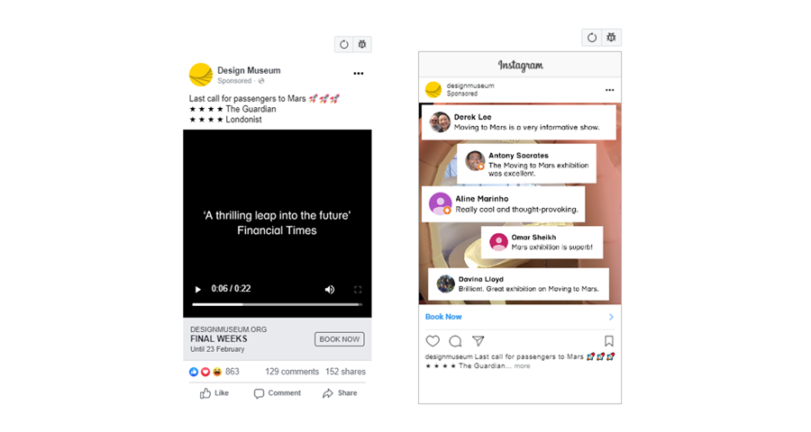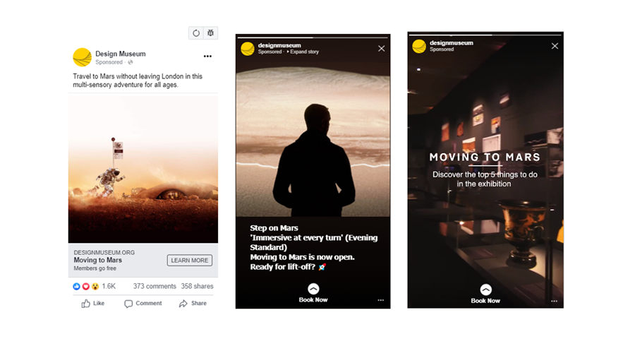 To encourage advance sales, a paid Facebook and Instagram campaign included targeting fans of NASA, Elon Musk, The Expanse (TV Series) and the European Space Agency. Sponsored Stories were promoted to London cultural audiences and exhibition enthusiasts. After opening, these ads were reactivated with press quotes.