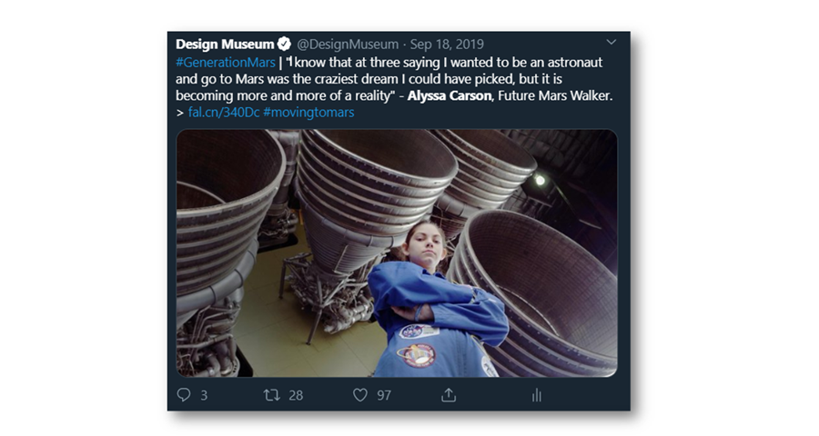 18-year old Alyssa Carson is the world’s youngest astronaut in training and a Future Mars Walker. Alyssa answered questions on camera for the Design Museum’s IG Stories, delivering over 30,000 Instagram impressions and 87,000 impressions on Twitter.