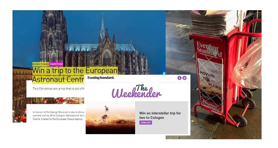 Exhibition visitors could win a trip to the European Astronaut Centre in Cologne. This was co-promoted with the Evening Standard, a free London newspaper. It featured across print, on kiosk stands at underground stations, and across their social media, website and email marketing channels.